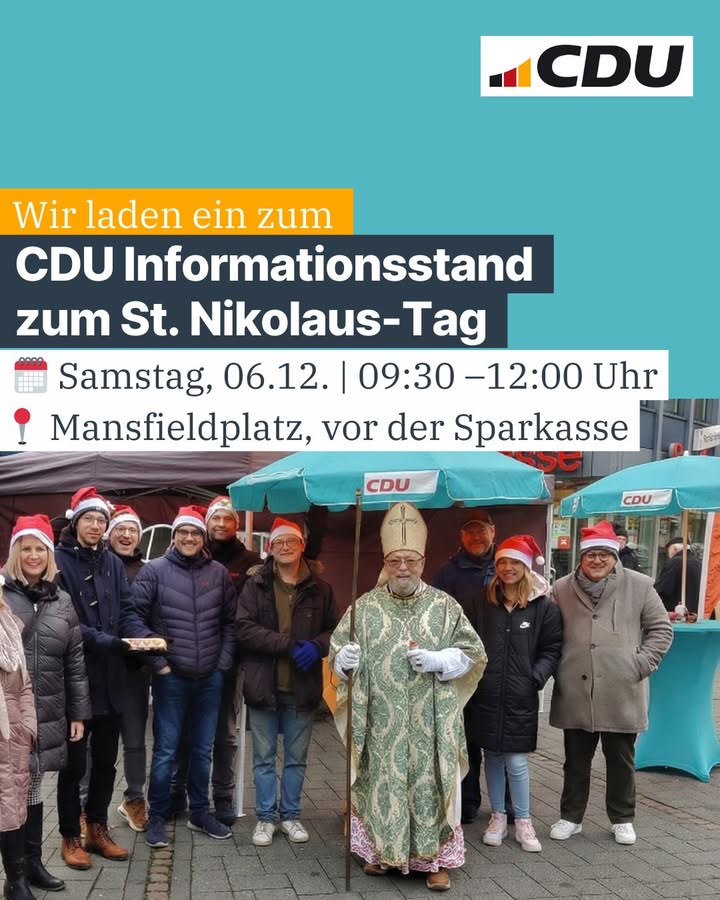CDU Informationsstand ? Eine kleine Freude zum Nikolaus! 🎅🥜Am St. Nikolaus-Tag möchten wir euch den Tag versüßen und ins Gespräch kommen. Egal ob Groß oder Klein ? wir haben eine schokoladige Überraschung für euch dabei. 📅 Freitag, den 06. Dezember 🕐 09:30 Uhr bis 12:00 Uhr📍 Mansfieldplatz, vor der Sparkasse